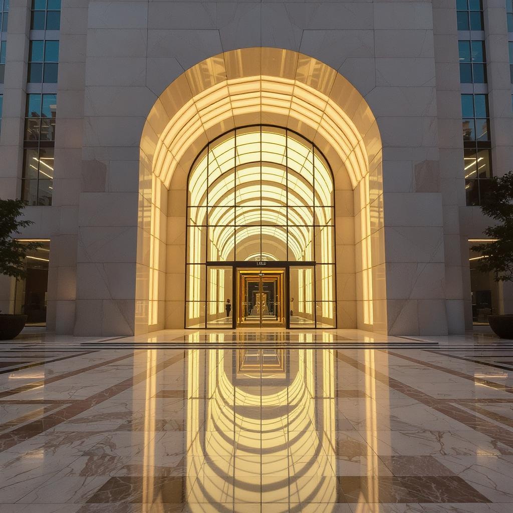 Modern minimalist architectural photography, grand entrance illuminated by sweeping curved light panels forming a dramatic arch, symmetrical frontal view with centered composition and vanishing point perspective, captured with a wide-angle lens from a low angle. The scene is bathed in the warm hues of golden hour, with a polished marble floor that mirrors the surroundings like a slick, reflective wet surface. Striking architectural lighting highlights the scene, and glass panels create an intricate grid pattern. Set in a contemporary urban environment, the image achieves photorealism and showcases rich, intricate detailing.