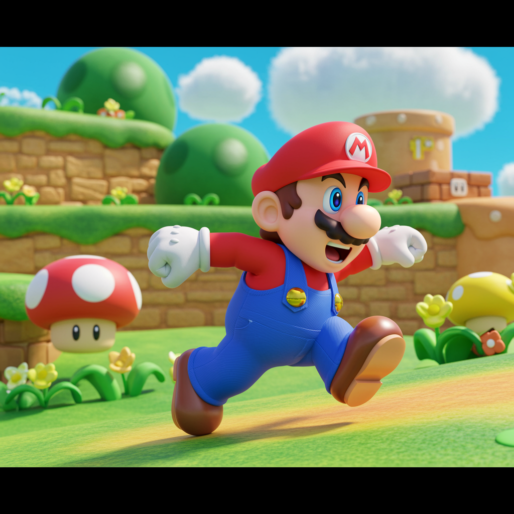Super-Mario dashing through a vibrant Mushroom Kingdom landscape, high-resolution 32k closeup with a dynamic and immersive feel, inspired by trending styles on poltcount 3D gaming, version 5.2. Captures the whimsical spirit and adventurous energy of the iconic game, with an aspect ratio of 2:3, sharp details and vivid colors, slight creative twist on the classic elements to enhance the visual allure, all set with a richness and quality enhancing factor of 2.