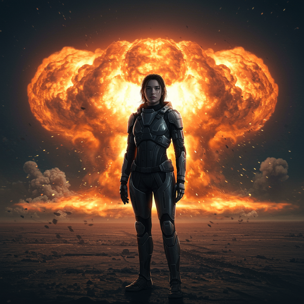 Portrait of a young woman in an exosuit, clad in sleek sci-fi armor, standing resolute against the backdrop of a massive nuclear explosion. The blast wave ripples around her, interspersed with swirling nuclear ash, evoking the chaotic beauty of atomic fission. Captured with max detail, the scene embraces a full-body view, reminiscent of high-definition movie stills in 8K UHD. The composition boasts cinematic and futuristic flair, infused with science fiction elements. The image captures the acceleration of a sudden flash of light, lending speed and dynamism to the scene, as if painted with long exposure. Complex lighting illuminates the setting, with intricate shadows accentuating the hyper-realistic, photo-realism that defines this cinematic staging.