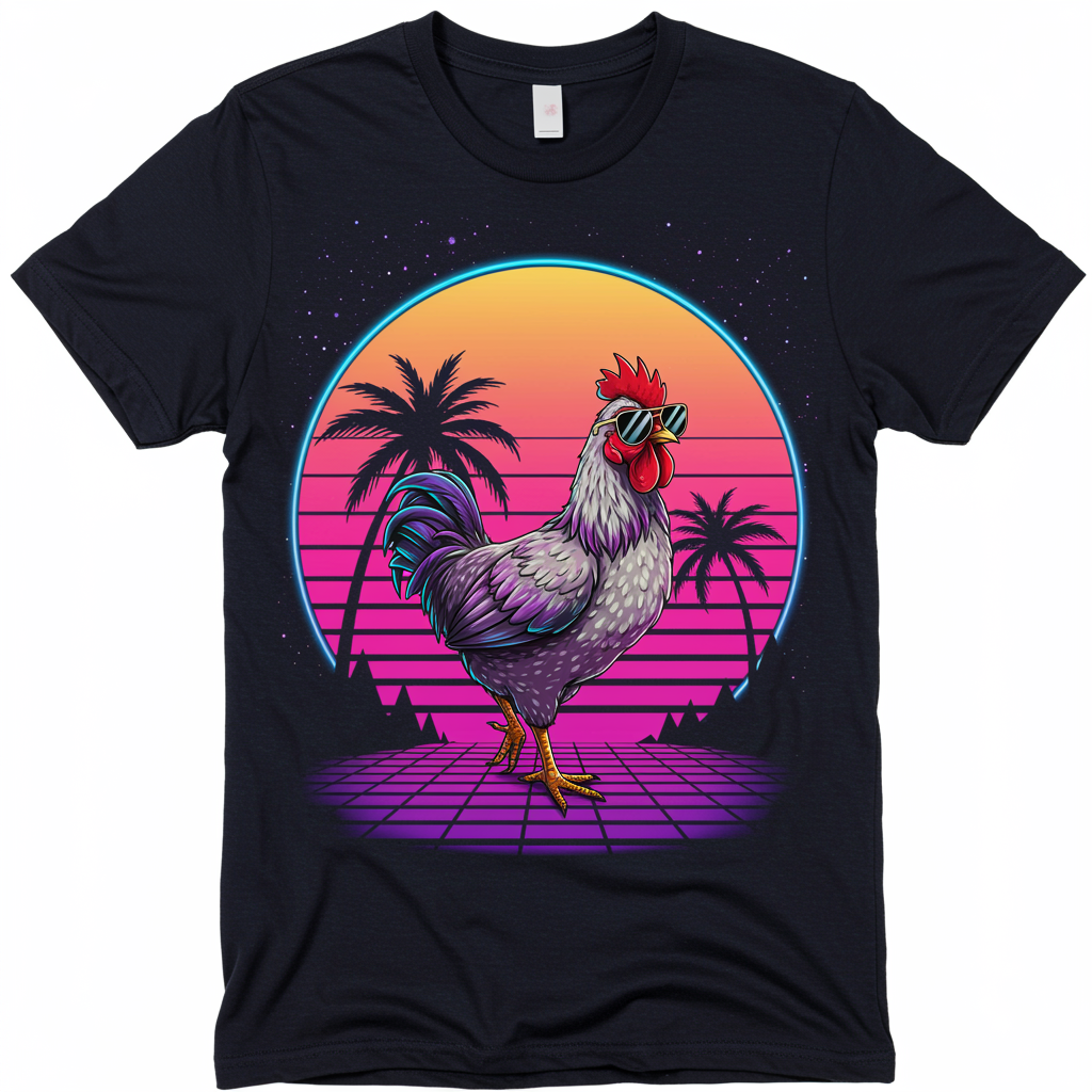 A vibrant t-shirt design featuring a synth wave chicken sporting aviator sunglasses, strutting confidently in front of a minimalist neon sunset, with palm trees silhouetted against a deep purple sky. The scene is bordered by a glowing, electric blue contour, adding a dynamic contrast to the dark, star-filled background.
