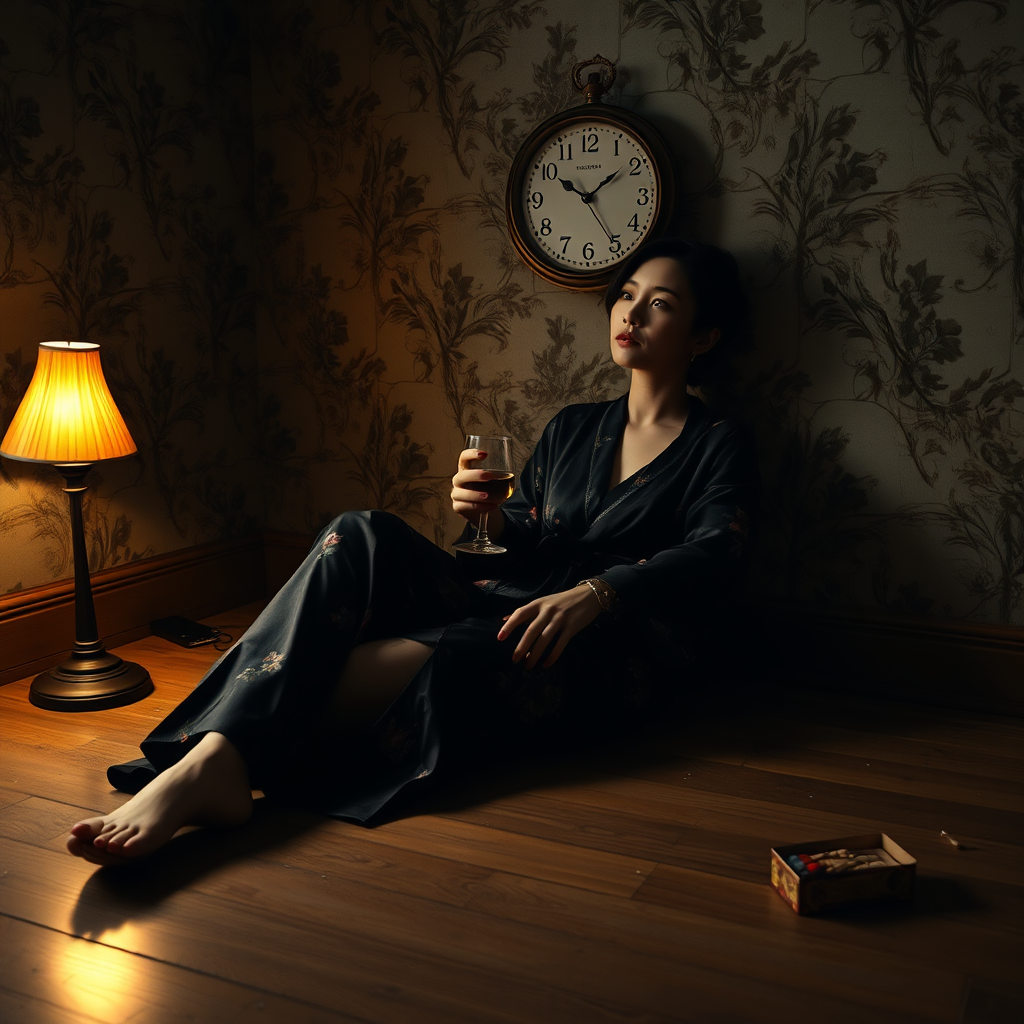 A moody, hyper-realistic cinematic scene depicts a woman seated on a wooden floor in a softly lit room, exuding a sense of calm and ease. She wears a dark, floral-patterned silk robe, her posture relaxed as she leans against the wall, cradling an empty wine glass in one hand. Beside her, a small amber lamp emits a gentle, warm glow, casting dramatic shadows that accentuate her silhouette. The wallpaper behind her features an intricate, vintage floral design, adding depth to the minimalistic setting. A vibrant, artistic wall clock above her subtly indicates the passing of time, while scattered details—a burnt matchstick and an ornate matchbox nearby—heighten the atmosphere of wistfulness and solitude. The overall color palette is understated, with soft hues, allowing the amber light and shadows to create contrast and richness in the scene. A contemplative, fine art photograph encapsulating a moment of serene introspection and urban isolation.