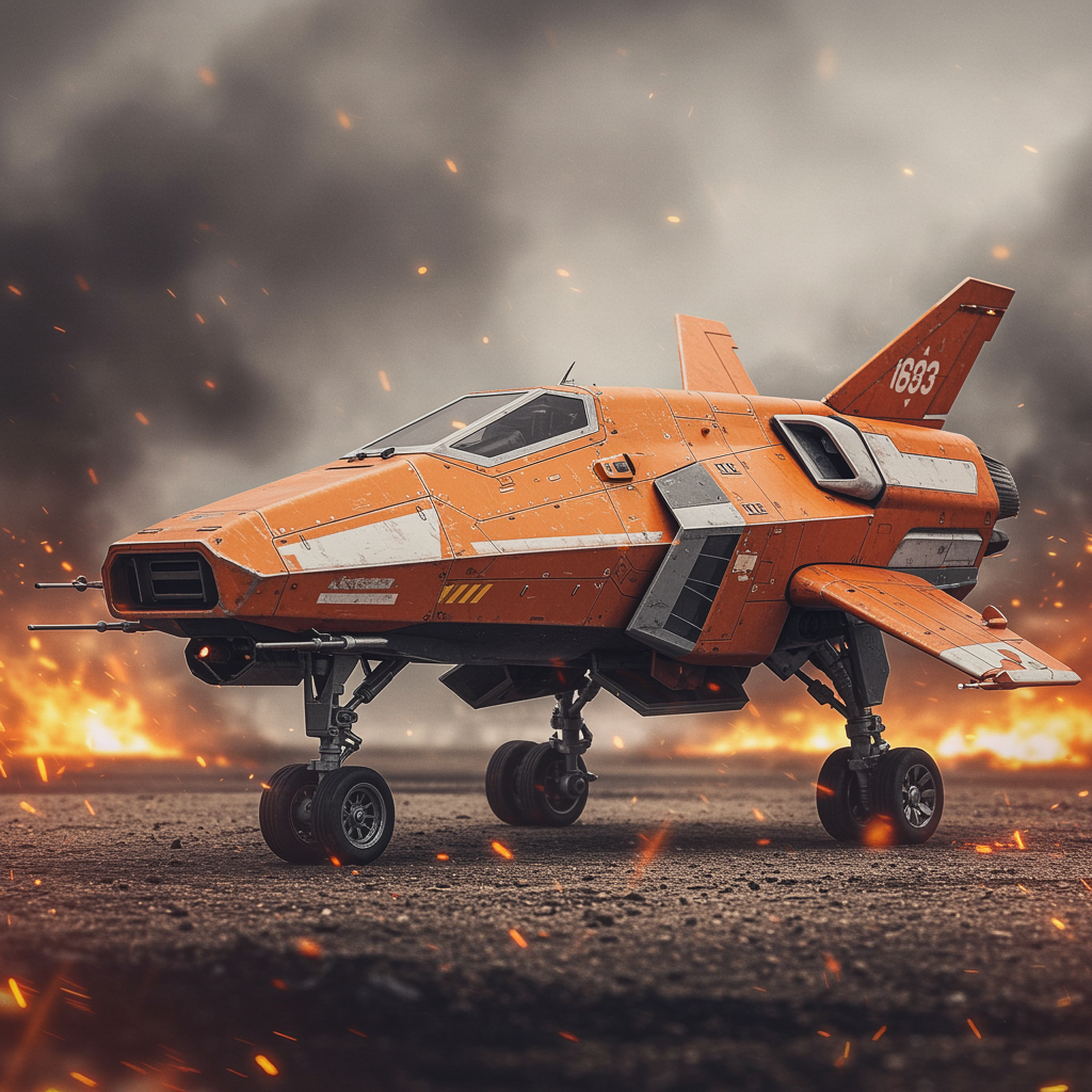Futuristic military jet-inspired spacecraft with sleek metallic orange body featuring matte black and white accents, exuding a sense of luxury and sophistication. The design is highly detailed and captured in 8k sharp focus, presenting an ultra-photorealistic and full wide-angle view. The scene blends Sci-Fi elements with a gritty warzone environment, where the craft is positioned on the ground with wheels deployed amidst an atmosphere of fire and chaos. Its appearance is both awe-inspiring and surreal, as if straddling the line between reality and an elaborate, lifelike model or toy display. This juxtaposition of high-tech innovation and imaginative artistry captures the essence of an untamed, visionary creation amidst a dramatic battlefield setting.