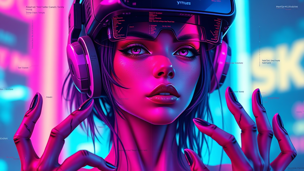 A cyberpunk-themed female VTuber with a highly detailed digital face, wearing a VR headset. The style is reminiscent of synthwave, capturing the essence of the futuristic, neon-lit world. Despite the vibrant 4K detail, there are intentional imperfections: text and error glitches scattered throughout, fingers and limbs are creatively altered, with some missing or extra digits. The character is slightly cropped, embodying an abstract, low-res aesthetic with subtle jpeg artifacts. Her form is unconventional, featuring warped anatomy and disfigured limbs that hint at a deformed, mutated nature. The image might appear blurry or fuzzy, with an artistic tiling effect. There is an intentional inclusion of elements that seem gross or unsettling, with occasional watermarks and signatures as part of its unique, imperfect charm.