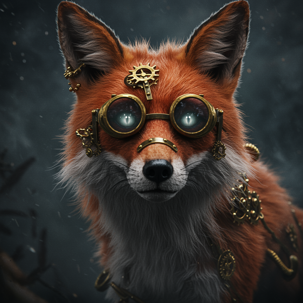 A steampunk red fox with intricate brass goggles and clockwork gears embedded into its fur, exuding a mysterious Lovecraftian aura. Its eyes glow with an eerie luminescence, set against a backdrop of swirling fog and dark shadows, capturing horror and intrigue. The scene, rendered with unreal engine and ray tracing, showcases hyper detail within a dimly lit environment. Heavy shadows contrast with soft, natural lighting that adds depth and texture to its fur, while dramatic, cinematic lighting creates an ethereal atmosphere. This digital art piece conveys a wide-angle view, combining the photorealism of portrait photography with magic, capturing the essence of a DND character design. Each element, from the intricate detailing of the fox's machinery to the volumetric lighting, contributes to the concept art's trendsetting presence on artstation, with smooth, sharp focus accentuating the excessiveness of detail in a hyper-detailed composition.