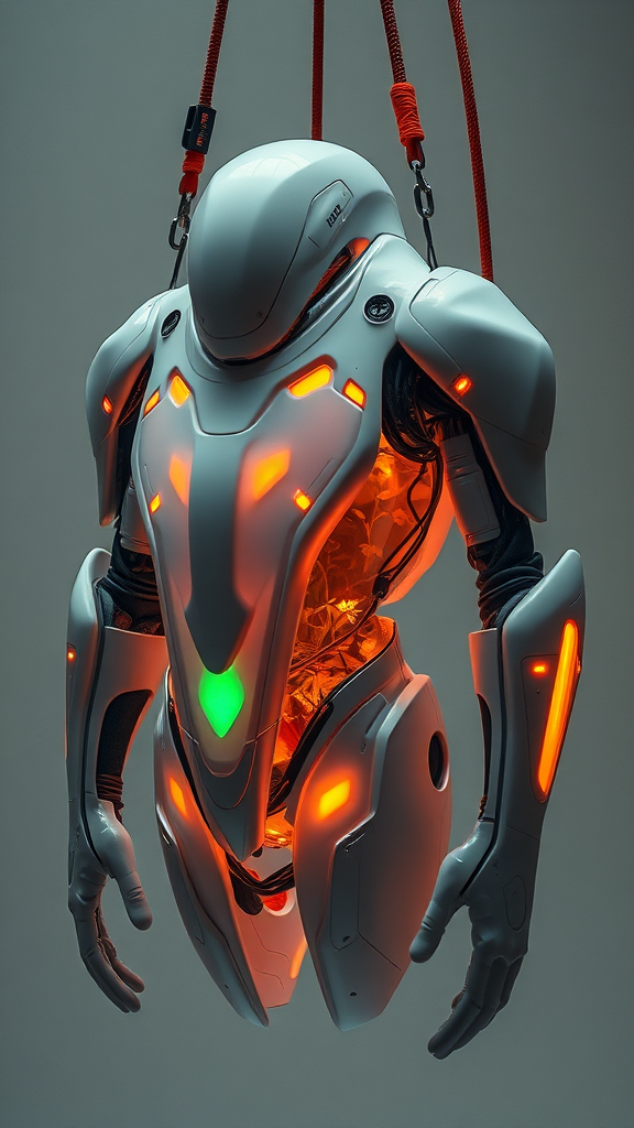 A cutting-edge photoshoot captures an advanced alien armor, suspended and showcased with vibrant, interwoven mooring straps that command the composition. The armor is forged from a translucent, milky material with a soft matte finish, offering a smooth surface and a misty translucence that hints at its inner contents, slightly obscured. Within, softly glowing bioluminescent plants and sparse electronic circuits radiate warm hues of orange and emerald, blending biotechnological and organic nuances. The armor's design is avant-garde and abstract, deviating from standard humanoid forms. It boasts elongated curves, irregular geometric lines, and unexpected articulations, evoking a creature-like, organic essence. The sleek appearance lacks any human resemblance, suggesting an innovative, fluid aesthetic that defies convention. The semi-translucence reveals a gentle glimpse of the interior, where flora and components blur into an ethereal presence. Elevated in suspension, the armor is held by dynamic mooring straps in electric blue, neon tangerine, and vivid lime, offering a bold contrast to the armor's soft matte exterior. These straps, reminiscent of high-end gallery installations, juxtapose the armor's sleek futuristic style with the pragmatic, utilitarian nature of the suspension. The backdrop is minimalist, featuring neutral gradients to direct attention to the armor. Organic touches such as moss, exotic foliage, and alien flora in bold yellows, purples, and greens subtly enhance the futuristic aesthetics. This contrast injects nature and vitality into the otherwise pristine, technological scene. The camera angle is deliberately unconventional, capturing a close-up view of the armor, revealing intricate details, the frosted material's texture, and the vibrant, chaotic mooring straps interlacing the scene. The lighting is soft yet focused, casting delicate reflections and highlights on the armor’s surface while emphasizing the contrast between the luminous plants and minimalist structure against the striking neon mooring system. Captured in hyper-realistic, detailed 35mm photography, this image channels the appearance of a high-tech fashion magazine shoot, with exceptional detail and vibrancy, drawing the viewer into this futuristic, otherworldly tableau.