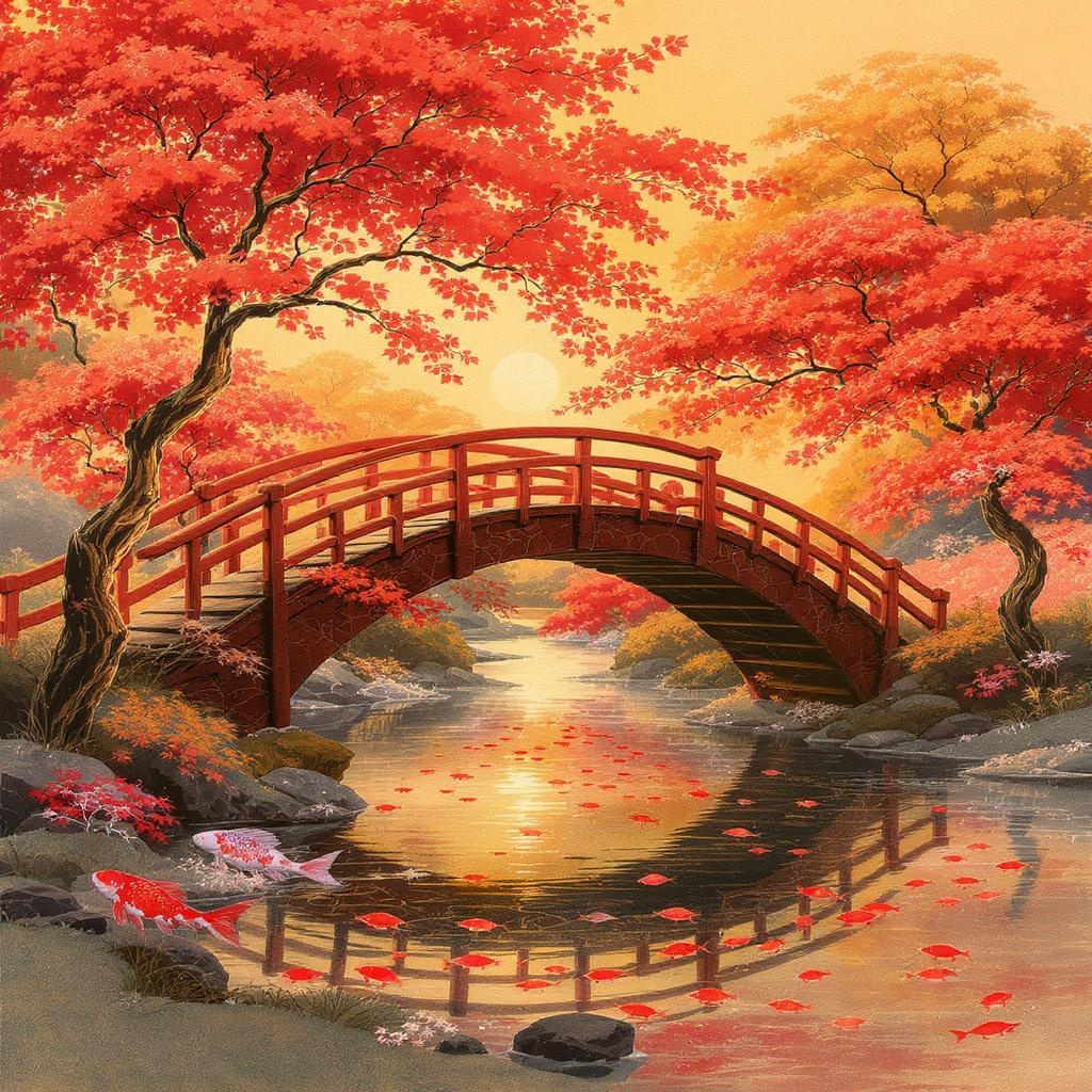 A Japan traditional art style illustration depicting a weathered red wooden bridge gracefully arching over a tranquil stream, surrounded by a cascade of stylized trees with delicate, curling branches. The warm, ethereal light of the golden hour bathes the scene in hues of amber and crimson, filtering through the leaves in abstract patterns. The ambience captures a perfect balance between serene nostalgia and lively modernity, inviting the viewer to pause and embrace the timeless beauty of nature. Shadows dance lightly across the water, and vibrant koi fish can be seen gently gliding beneath the bridge's reflections.