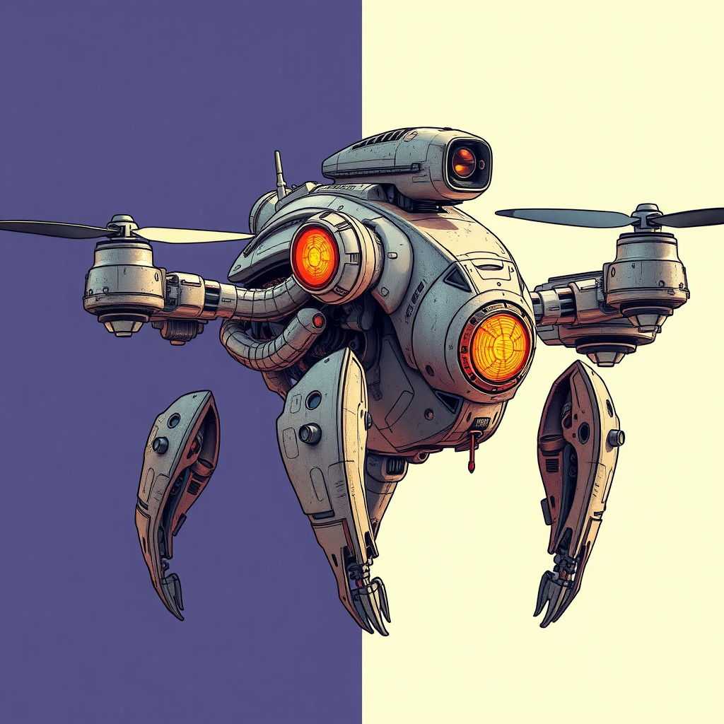 Futuristic sci-fi drone robot, whole body, cinematic with intense composition and lighting, vivid color grading, features a poorly drawn cathedral-like robot with mutated and deformed aspects; distorted and disfigured yet intriguing, it exudes an ugly beauty, blending baroque elements with a Manet-inspired cartoon and abstract sketch style; anatomy is intentionally wrong, creating a blurred sense of reality that captures both the worst and most captivating qualities in a mesmerizing cinematic vision.