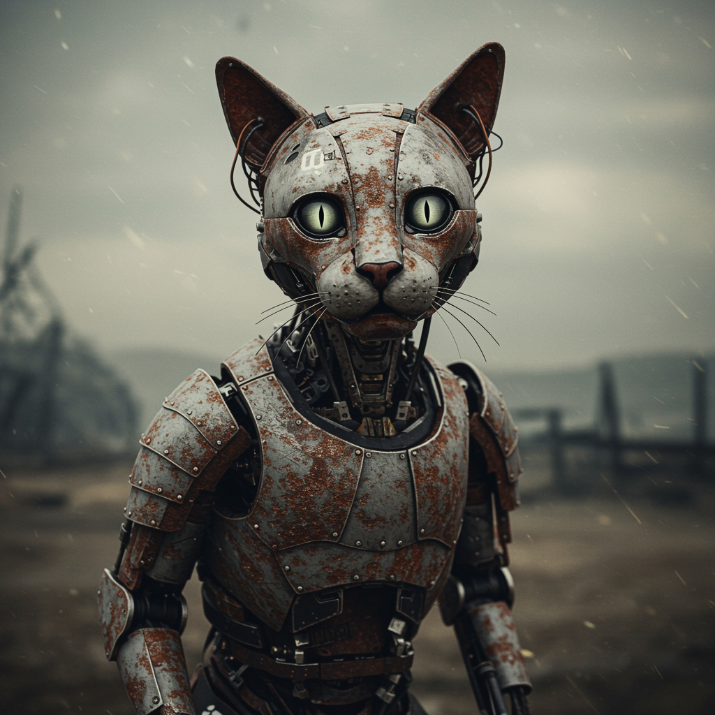 A mechanical cyborg cat with rusty old armor and ancient metal plating, featuring exposed wires and cables, stands in an apocalyptic landscape. The creature gazes directly at the viewer, its piercing eyes set against a backdrop that suggests desolation. Captured in a portrait-style photograph, the scene boasts realistic, photo-realistic detailing in 8k resolution. The skin of the cyborg displays hyperrealism, with diffused soft lighting and shallow depth of field adding depth and emotion to the image. The meticulous attention to sharp focus and cinematic lighting enhances its eerie and creepy appearance, offering an unsettling glimpse into a world where technology and decay merge. Despite its mechanical form, the cat exudes an uncanny lifelike aura, drawing attention to its intricate design without compromising the essence of fear.