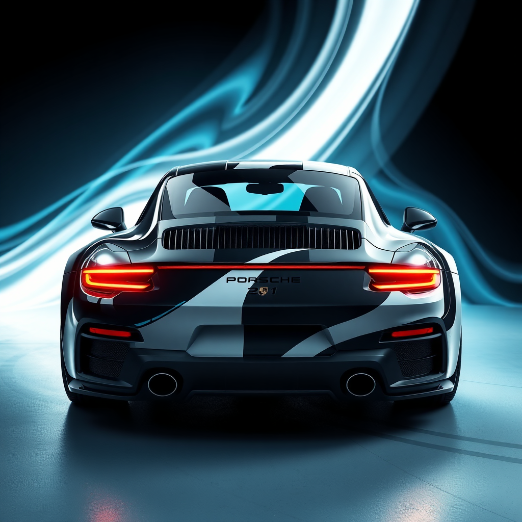 Abstract digital artwork featuring a backlit Porsche 911 with a striking blend of black, white, and blue hues, 3D fluid design with sharp lines, enhanced depth of field, detailed shaders and RTX optimization. Incorporating CGI elements with volumetric light and octane rendering to create an immersive, high-quality visual suitable for wallpaper. The composition includes subtle creative variations with dynamic lighting to evoke a futuristic and sleek aesthetic.
