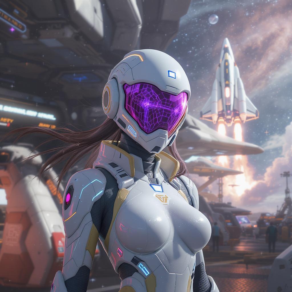 Female protagonist in a sleek, form-fitting white and yellow jumpsuit with intricate detailing, stands poised in a bustling spaceport. In the backdrop, a majestic spaceship ascends, leaving a trail of fiery propulsion. Her face is partially concealed by an advanced mask, adorned with a striking purple sci-fi visor, emitting subtle, otherworldly hues. The setting is vibrant and bustling with futuristic elements, illuminated by cinematic lighting that highlights the hyperrealistic environment. The scene embodies a surreal, divine quality, reminiscent of a celestial anime landscape, with intricate details and a vivid color palette. The atmosphere is a blend of smooth, shiny surfaces and a stunning, surreal atmosphere captured through the lens of Unreal Engine 5 technology, enhanced by Lumen reflections and CGI brilliance. The overall composition stands out as a cinematic masterpiece, blending sci-fi aesthetics with a dreamlike quality, rendered flawlessly in 3D.