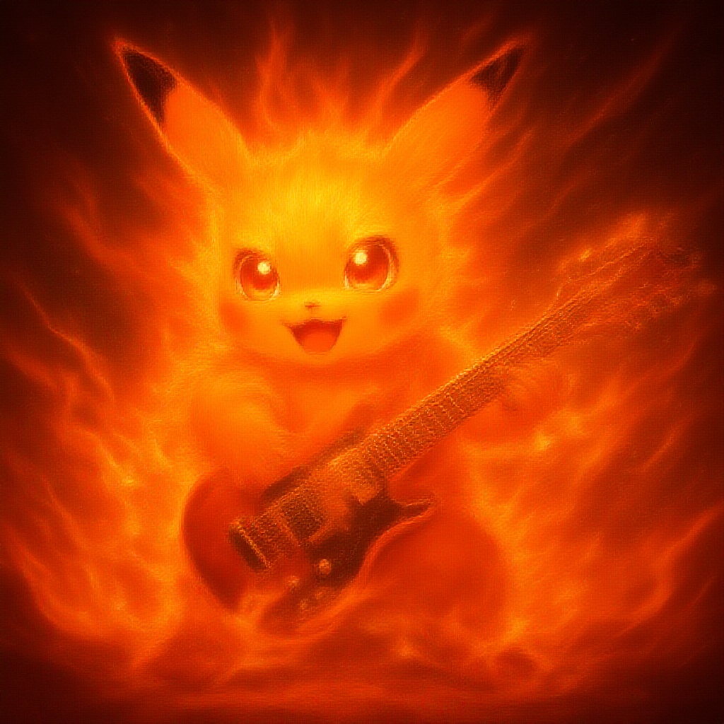 Hyper-realistic anime-style Pikachu engulfed in vibrant flames, passionately strumming an electric guitar with sparks flying, its fur glistening with a fiery glow amidst a dynamic, electrifying atmosphere.