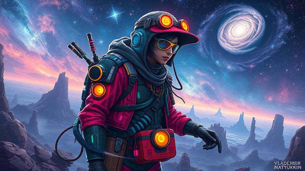 Galaxy cybergoth adventurer in the style of an interstellar Indiana Jones, illustrated by Vladimir Matyukhin. This character navigates ancient alien ruins with a mix of futuristic technology and classic exploration tools. They are adorned in a vibrant, high-tech outfit combining elements of punk and sci-fi, featuring glowing accents and intricate cybernetic accessories. The setting is a breathtaking cosmic landscape with distant nebulae and swirling star clusters, emphasizing the blend of exploration and the mysteries of the universe.
