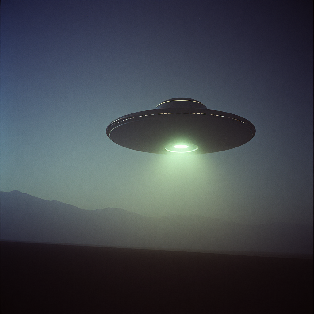 A stunning still from a 1988 sci-fi film with a rich, authentic 35mm film grain texture captures a live action scene featuring a mysterious, all-black UFO hovering in the night sky, embodying a sense of timelessness and the pursuit of knowledge. The futuristic ghostly presence adds an eerie elegance to the scene. Shot with a Hasselblad H6D-100c and an XCD 85mm f/1.8 lens, the image exudes a raw, cinematic feel with a chaos-infused ambiance that enhances the otherworldly atmosphere. The composition engages the viewer in a journey through an enigmatic narrative, stylized to perfection with a classic sci-fi flair.