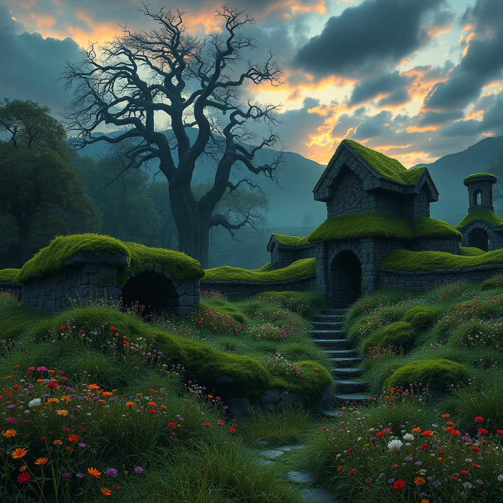 A mystical twilight descends over a fantasy Celtic kingdom, where towering ancient trees and lush, vibrant green grasses blanket the landscape. Wildflowers of every hue spring from the earth, weaving through the undergrowth and hinting at the magic alive within. The kingdom is shrouded in a rich, mysterious dusk, with the sunset casting deep, enchanting shadows across timeless stone structures covered in moss. The scene feels both eternal and ethereal, as if whispered legends of old could burst forth from the land itself.