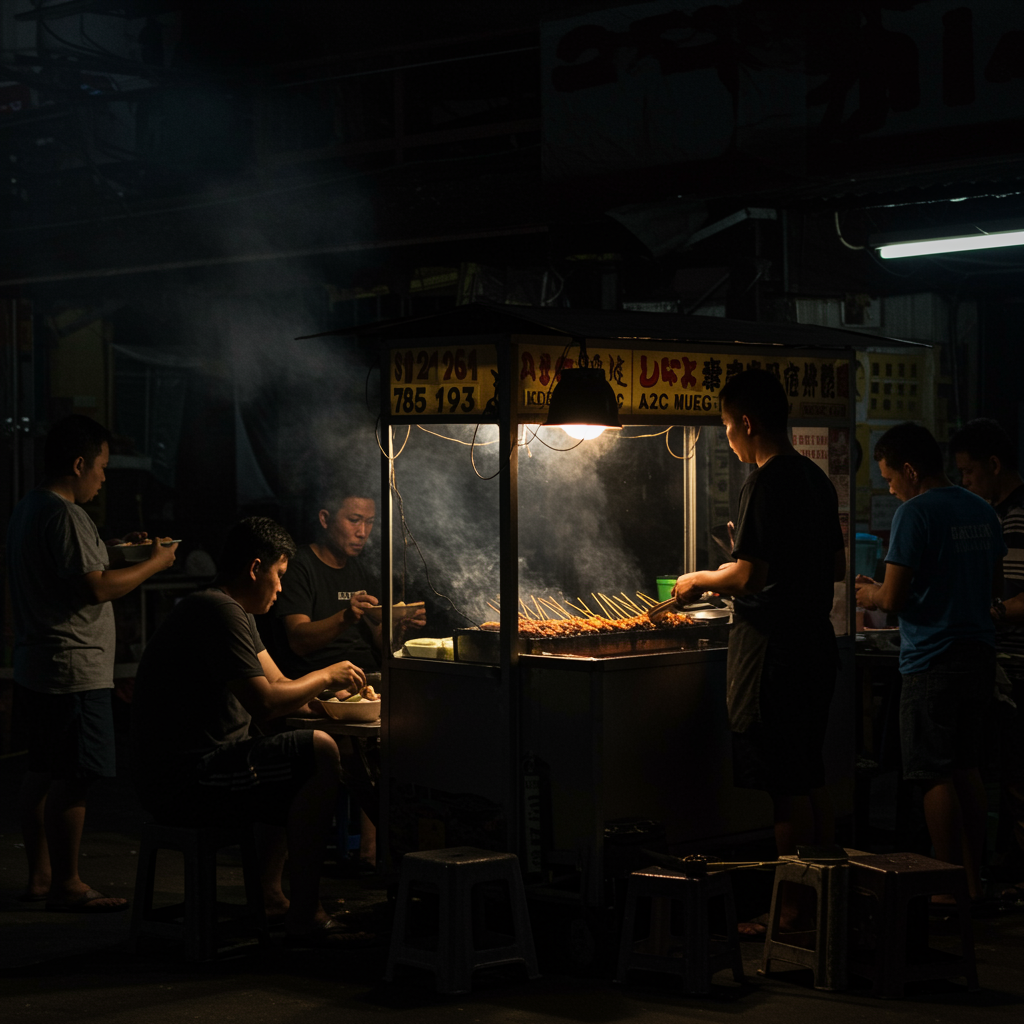 A bustling Malaysian street food stall at dusk, enveloped in moody, dark tones, where the rich aroma of sizzling satay fills the air. Dimly lit by a single, flickering lantern, the scene is alive with the chatter of people eagerly waiting for their turn. The vendor, a seasoned master, expertly grills skewers over an open flame, sending wisps of smoke curling upwards. The surrounding atmosphere is an eclectic mix of exotic spices and savory flavors, as patrons gather on mismatched stools, sharing stories and laughter under the deepening twilight.