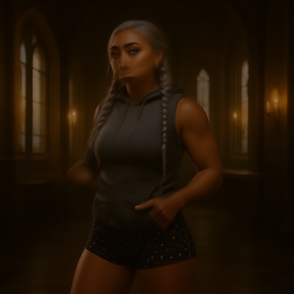 A striking landscape portrait captures the essence of fitness and fashion with a unique flair. The focus is on a 24-year-old Kazakh-Hungarian female, a confident CEO with a challenging head tilt that exudes determination. Her visible ribcage and smooth, defined muscles are highlighted, showcasing toned abs under her flat chest and small breasts. Her golden brown skin glows naturally as if kissed by the sun, with each pore and texture meticulously in focus. Her large, pill-shaped honey eyes glisten, enhanced by long, elegant eyelashes. Her metallic silver hair is styled expertly in Dutch braids, and her sculpted brows complement her delicate features. She sports a sleeveless hoodie and midriff-baring polka dot shorts, standing in a victorious pose positioned on the left side of the frame according to the rule of thirds. The enchanting backdrop features the Hogwarts Great Hall, subtly illuminated by lightbox effects, while soft natural lighting reminiscent of Paulina Olszynski envelops her form, creating an atmosphere of magic and empowerment.