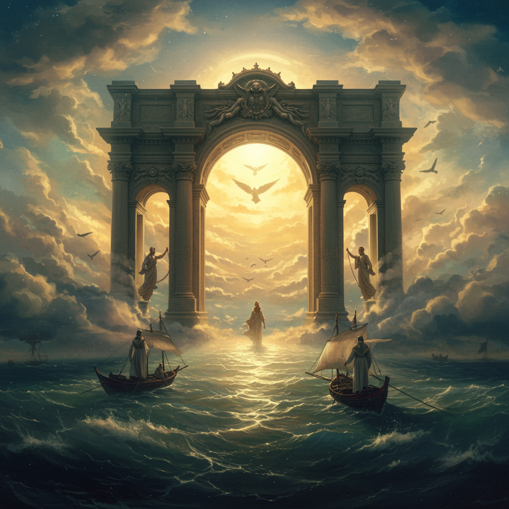 Cinematic vision of the gates to heaven, intricately detailed, 8k resolution, hyper-realistic, atmospheric ambiance, inspired by the styles of Ivan Aivazovsky, Peter Mohrbacher, and Greg Rutkowski. A grand portrayal featuring volumetric light effects and expansive illumination, blending oil painting techniques with fantasy and sci-fi influences. Imbued with the realism and depth of premium prints, reimagined through the lens of Unreal Engine’s capabilities.