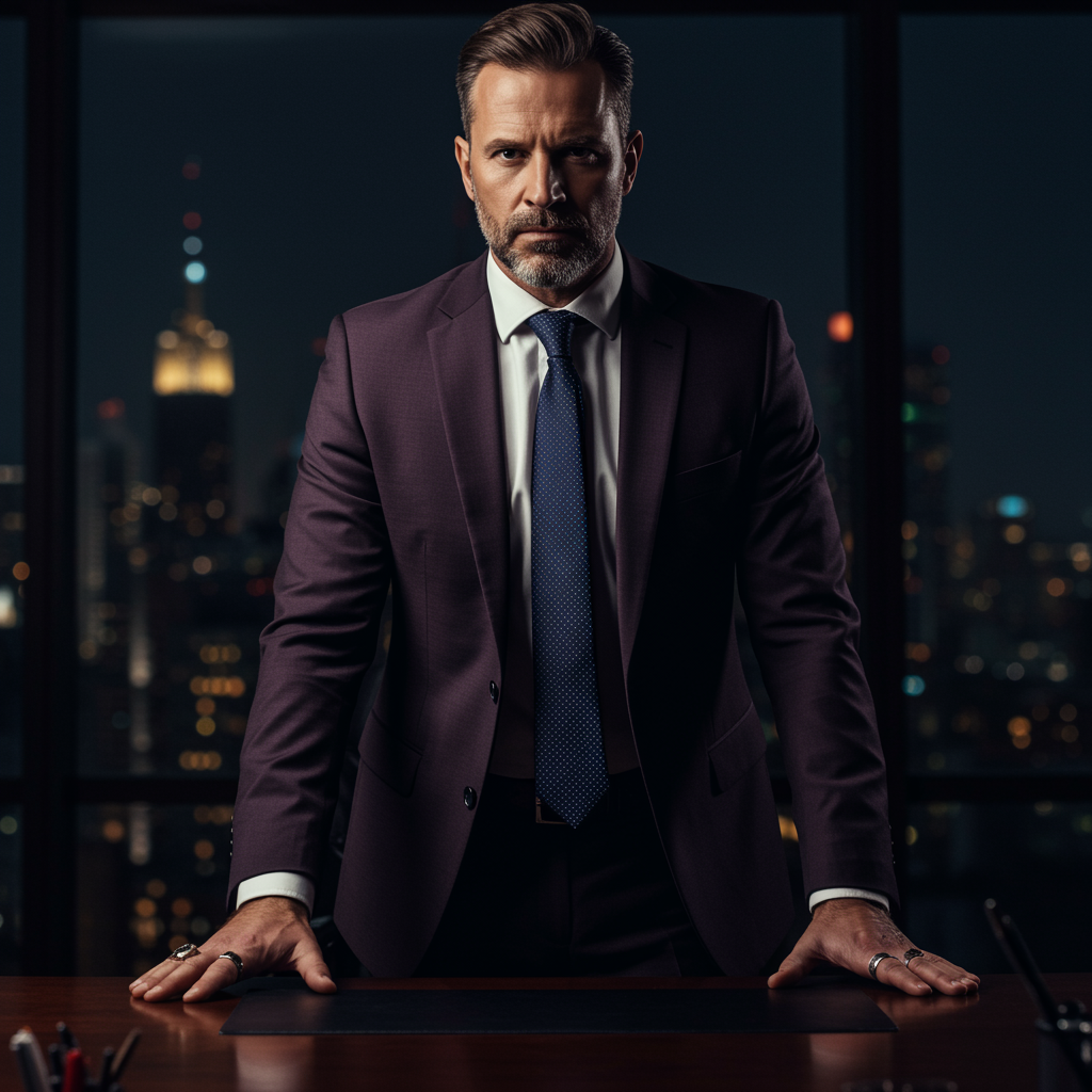 A powerful businessman with an imposing presence, his chiseled features and intense gaze reflecting a deep, strategic intellect. He stands amidst the shadows of a dimly lit office, the soft glow from the city skyline casting dramatic contrasts across his face. His impeccably tailored suit, in shades of deep purple and black, hints at his commanding influence and authority in the corporate world. His large hands, adorned with rings that symbolize power and achievement, rest confidently on the polished mahogany desk, where important decisions that shape the future are made.