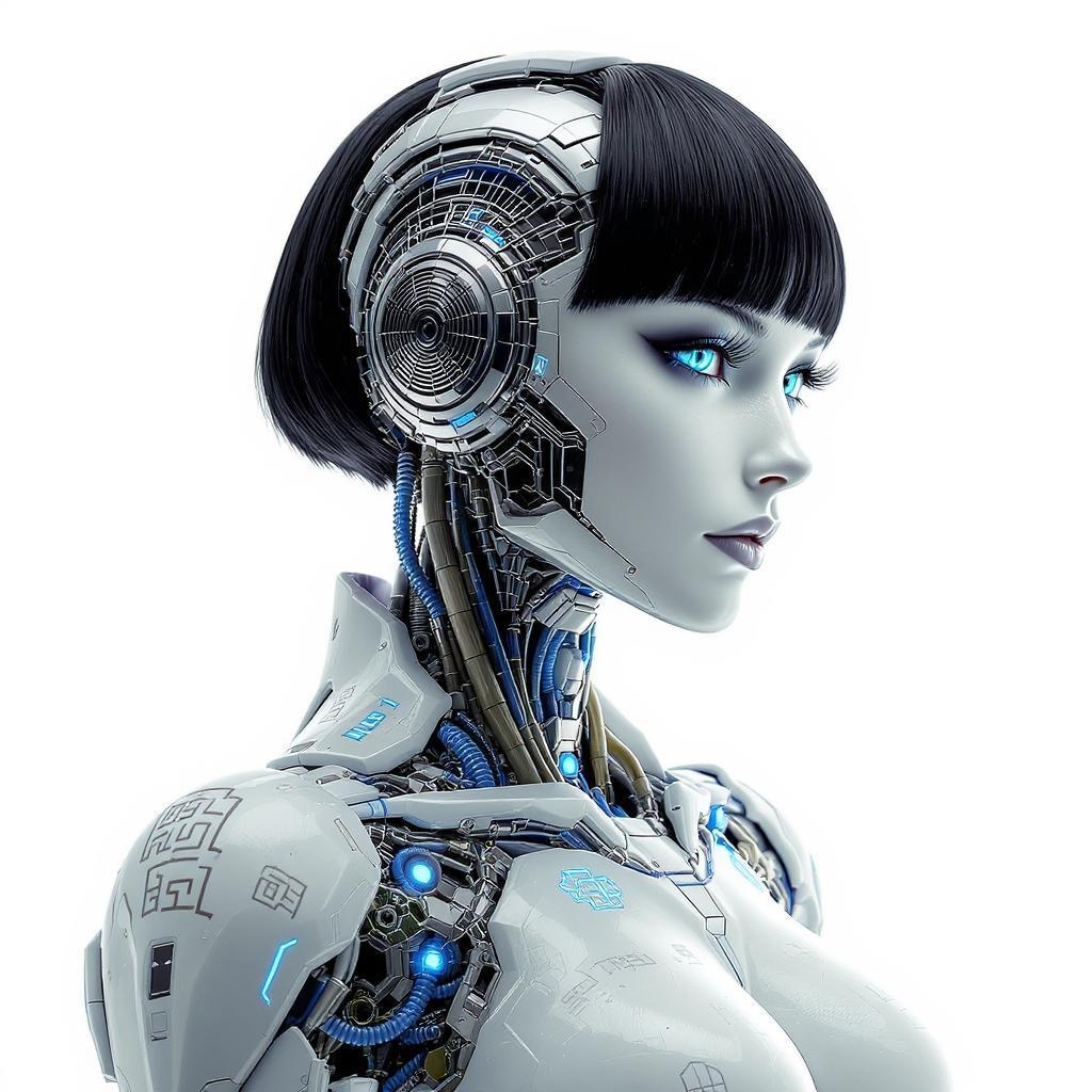 Hyperdetailed cyborg half body shot, feminine android with glossy white porcelain skin, sleek black bob haircut, hyper-realistic eyes with extended lashes, elaborate mechanical components in silver and chrome, vibrant blue LED accents and power circuits, intricate hydraulic tubes and biomechanical connections, semi-transparent white polymer armor with a shimmering iridescent effect, interactive holographic interface elements, ancient techno-hieroglyphics carved into armor plating, key lighting from a front-right angle, professional studio lighting, 8k resolution, octane render, hyper-realistic texturing, precision-engineered mechanical features, pristine white background, cyberpunk aesthetic, inspired by Japanese sci-fi art, ultra-sharp focus, ray-traced reflections on metallic surfaces, photorealistic skin textures merging with mechanical components unknown.