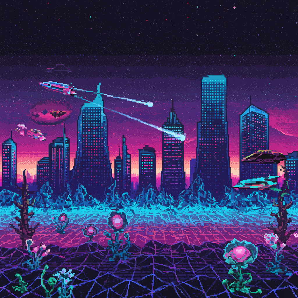 Elon Musk inspired futuristic pixel art scene featuring a sci-fi landscape with robotic elements, vibrant neon colors, and a digital mosaic style capturing Musk's visionary outlook.