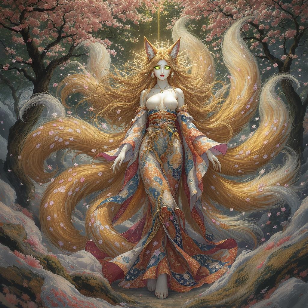 In this hyper-maximalist masterpiece, a mesmerizing image of the ultimate nine-tailed fox girl emerges. She stands gracefully within a mystical forest, emanating ethereal elegance. Her flowing hair, the color of molten gold, glows with an inner luminescence. Her iridescent emerald eyes, full of ancient wisdom and playful mischief, enthrall those who gaze upon them. Her porcelain-like skin is adorned with intricate cherry blossom patterns that subtly shift with the light. Her nine glorious tails, each decorated with patterns inspired by different art movements, create a harmonious visual symphony. Her exquisite kimono, inspired by traditional Japanese woodblock prints, brims with meticulous detail. The enchanted forest around her bursts with vibrant colors, seamlessly blending elements of surrealism and fantasy. This epic masterpiece evokes awe, through hyper-realistic rendering and intricate detailing, showcasing a seamless fusion of styles. It stands as a groundbreaking testament to the artist's prowess, inviting viewers into a world where beauty and magic coexist. With unrivaled attention to detail, it transcends visual barriers, offering an everlasting encounter with the extraordinary nine-tailed fox girl—a breathtaking embodiment of artistic mastery.