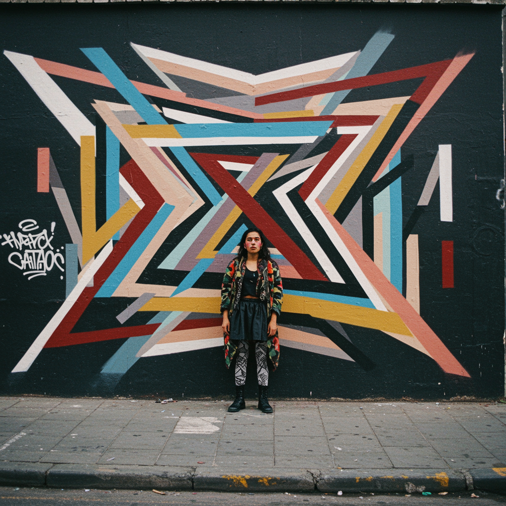 A vibrant 90s street photographer captures a self-assured model poised in front of a dynamic graffiti mural in Santiago, featuring a kaleidoscope of straight, bold colors. The model's avant-garde attire, reminiscent of Tokyo Fashion Week, harmonizes seamlessly with the mural's intricate geometric patterns, creating a mesmerizing fusion of color and form.