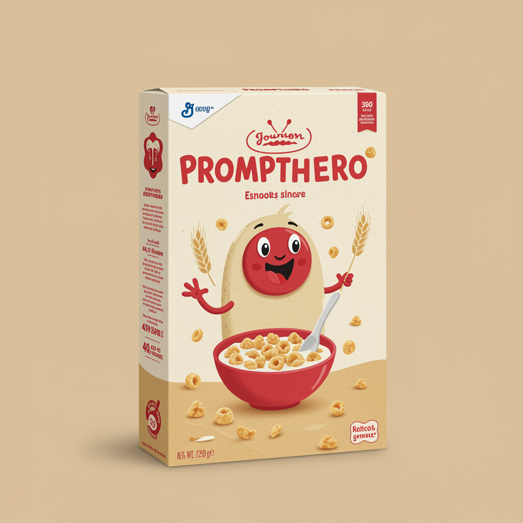 Create an eye-catching cereal box design featuring a playful mascot with the word "Prompthero" prominently displayed above. The box incorporates a minimalist aesthetic with clean lines, utilizing a color palette of red and sand for accents. Add subtle, imaginative elements to enhance visual appeal while preserving the essential theme and concept.