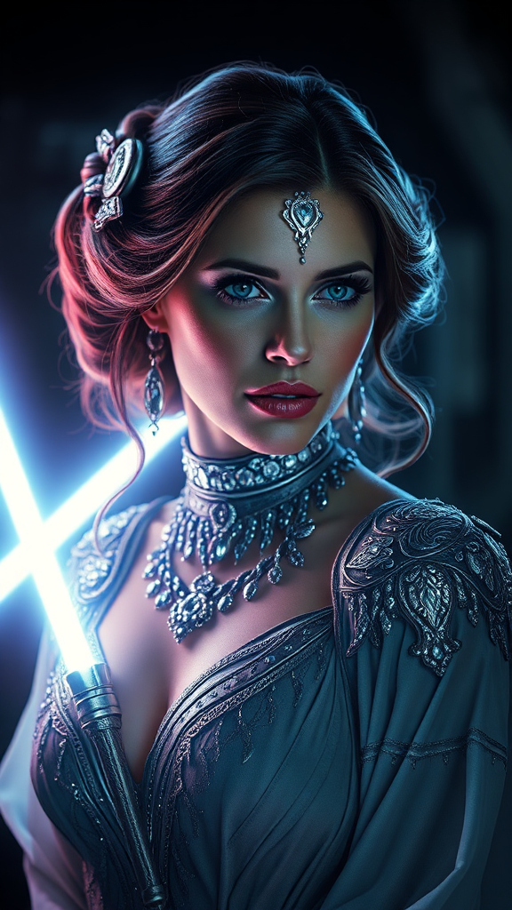 Princess Leia in a nightly glow adorned with intricate silver details, surrounded by a luminous beam, set in a dark fantasy world reminiscent of Luis Royo's artistry. Captured in a cyberpunk-inspired studio portrait, this masterpiece boasts 8K UHD HDR quality, delivering a stunning visual experience. Elements such as low resolution, out-of-frame distractions, blur, jpeg artifacts, watermarks, logos, text, and cropping are absent, allowing Leia's elegant and ethereal presence to captivate without distractions.