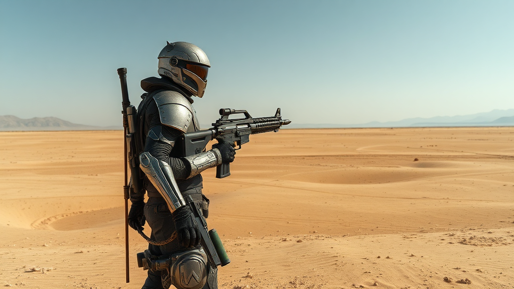 A lone peacekeeper stands vigilant in a vast, desolate futuristic desert, part of a post-apocalyptic security force. Clad in meticulously crafted, forged armor that glimmers under the harsh sun, they are ready to enforce order. Their weapon of choice, a sleek energy rifle, is an advanced piece of technology, humming with dormant power. The cinematic landscape stretches out in a wide-angle view, capturing the expansive openness around them. The scene is rendered in striking detail, with an HDR richness and 8k clarity that brings the gritty realism of this world to life against the backdrop of an endless horizon.