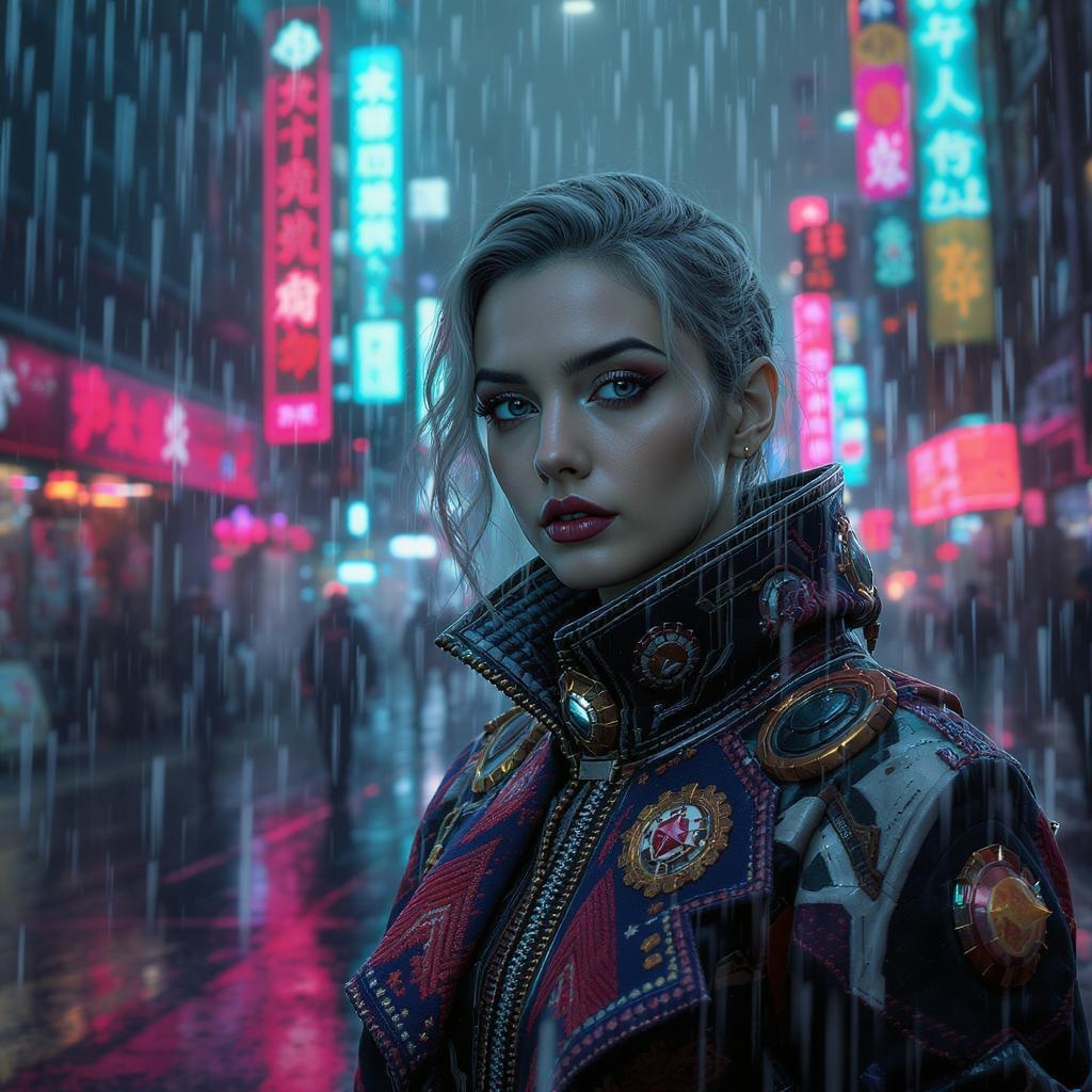 A beautifully detailed portrait of a European young woman in a rain-drenched movie setting, wearing a futuristic sci-fi fashion jacket reminiscent of royal attire. Inspired by the artistic styles of Ismail Inceoglu, Dragan Bibin, Hans Thoma, Greg Rutkowski, Alexandros Pyromallis, and Magritte, the image showcases a perfect face with sharp chin and fine details. The scene exudes cyberpunk and Neotokyo aesthetics with synth-wave influences, set against the dramatic backdrop of a Bladerunner-like environment. The lighting enhances the hyper-realistic, high-contrast look, captured through an f1.6 lens for photography that emphasizes rich colors and lifelike textures. The portrait resembles an ultra-high-resolution, highly detailed CGI with an 8K wallpaper quality, preserving realism and perfect proportions. Artistic elements blend seamlessly in this digital art piece, avoiding any negative aspects such as distortion or implausible features, resulting in an enchanting and captivating visual narrative.