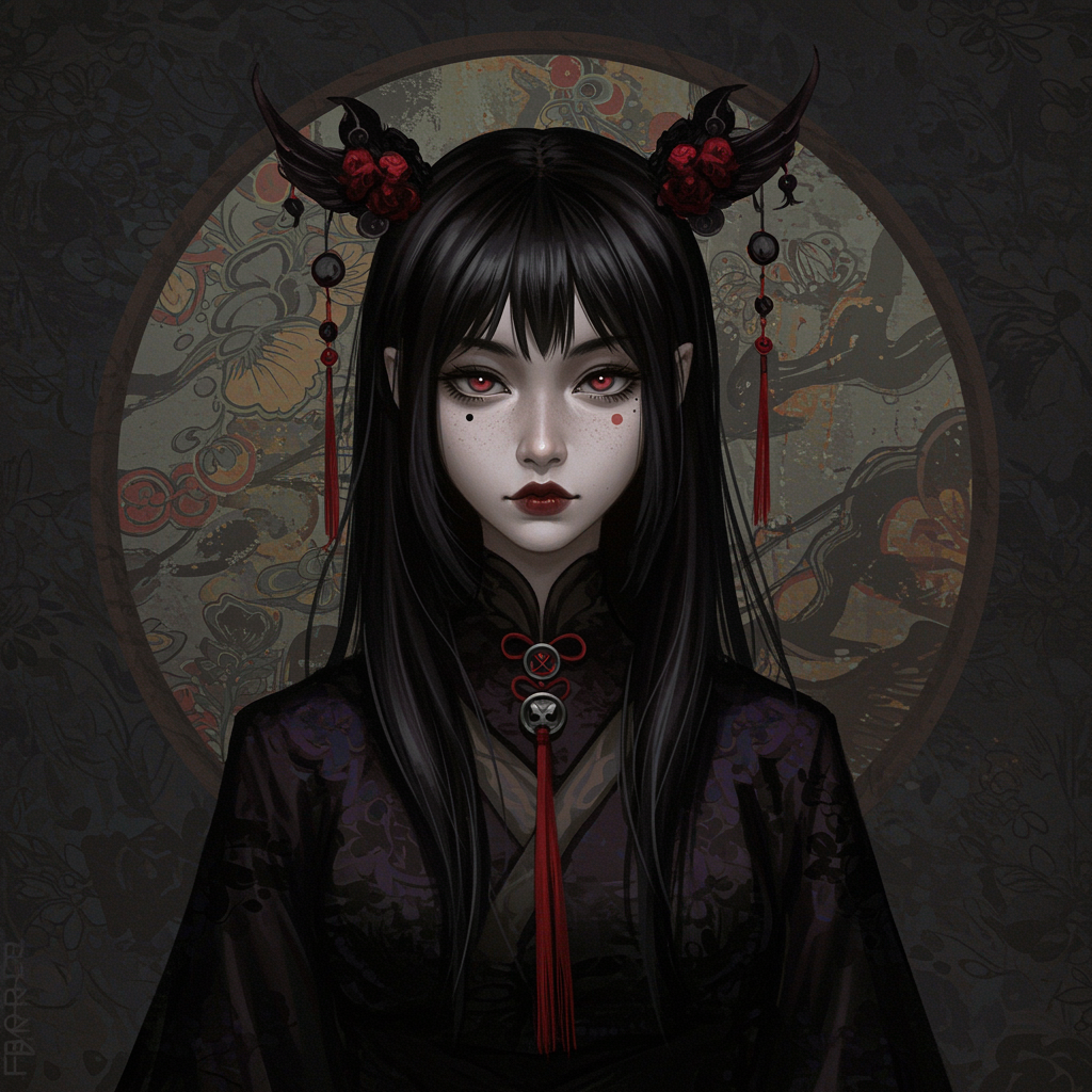 A dark-haired girl with an Asian-inspired attire, depicted in a subtle ink application style, blending elements of appropriation art and gothcore. Her portrait, crafted with ZBrush-like character caricatures and painted illustrations, hints at hidden meanings. The visual narrative is rich and intriguing, resembling a mysterious tapestry of cultural motifs.