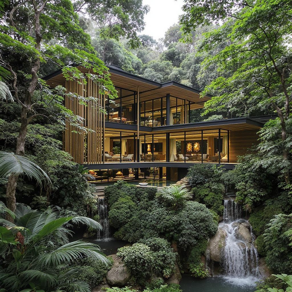 A stunning residence embracing tropical modernism nestled within a lush forest, surrounded by a vibrant array of trees and exotic plants. The home's design features expansive glass walls, allowing natural light to flood the interior while offering panoramic views of the verdant surroundings. Wide, airy verandas and open-plan living spaces create a seamless transition between the indoors and the tropical landscape outside. The structure incorporates organic materials like bamboo and local stone, blending effortlessly with the natural environment. The serene atmosphere is enhanced by water features such as tranquil ponds and a gentle cascading waterfall, fostering a harmonious connection with nature.