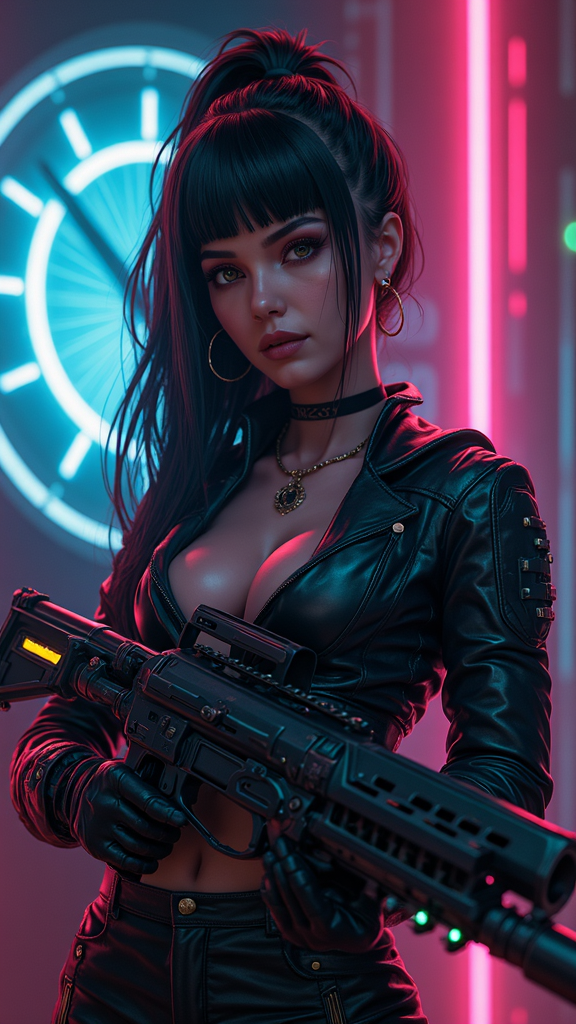 View this AI-generated image featuring a portrait of a woman holding a futuristic weapon intricately detailed set against a backdrop of cyberpunk clocks and laser beams she wears advanced cyberpunk gear blending seamlessly into a science fiction world inspired by the aesthetics of cyberpunk 2077 the