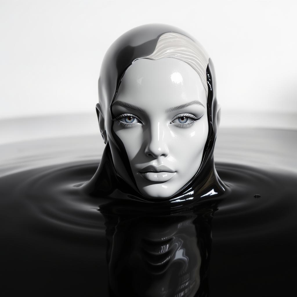 A pinnacle of artistic achievement, blending modern simplicity with futurism, creating a visually striking image. Featuring a stunning, both simple and sophisticated view, with perfectly coordinated colors, and observed from a front perspective under bright lighting. This artwork delves into surrealism, existing in a mesmerizing fantasy world captured in a fantasy style. It presents an artistic close-up of a female supermodel crafted from glossy ceramic material, her deep, captivating eyes and flawlessly symmetrical face emerging from a silky black liquid, akin to oil. The black liquid enveloping her face offers a stark yet harmonious contrast to the delicate, luminous white ceramic of her form, enhancing the image's captivating allure and otherworldly essence.