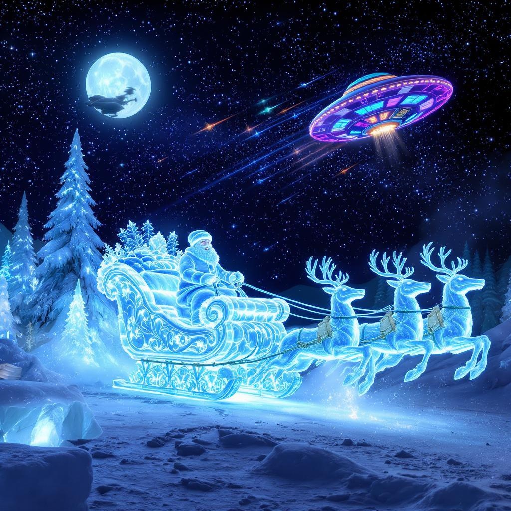 A mesmerizing ice fairytale scene unfolds with Santa, carved from crystal-clear ice, guiding an intricately designed ice sleigh through the starlit sky. Majestic ice deer, shimmering under the moonlight, pull the sleigh with ethereal grace. Above, a thrilling chase ensues as an otherworldly UFO, glowing with vibrant colors, weaves around in a celestial dogfight, creating a dazzling spectacle against the midnight backdrop.