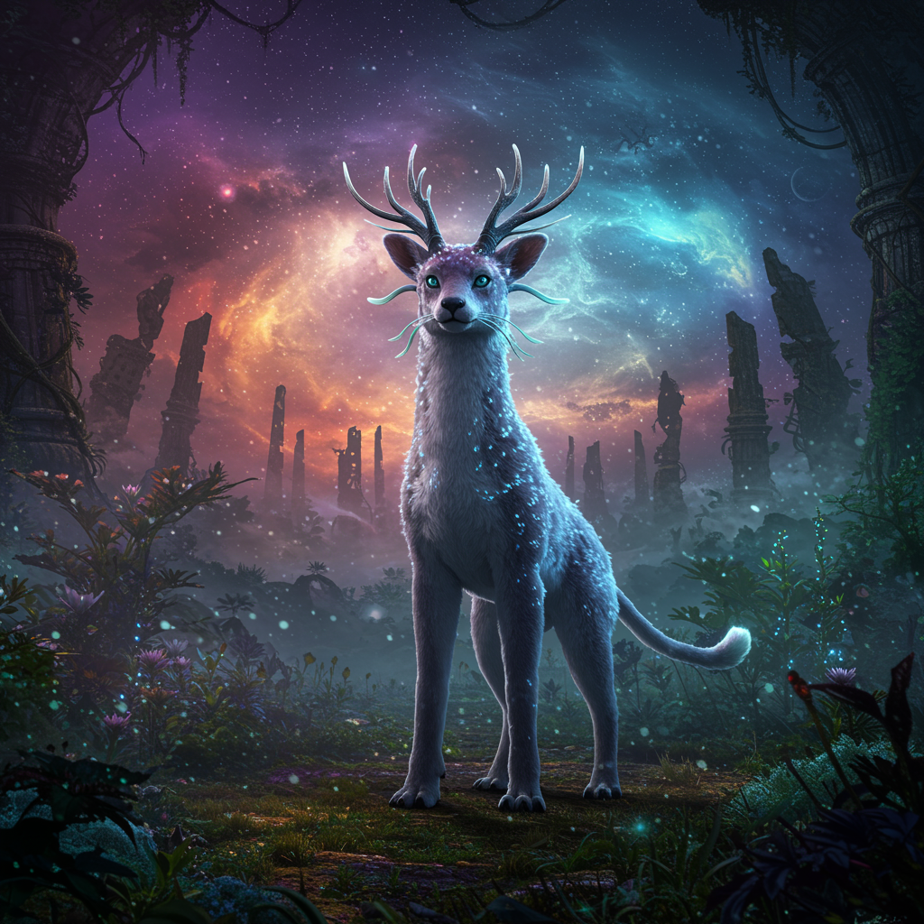 A full body portrait of an enchanting fantasy creature set against the backdrop of an extraordinary fantasy planet. The creature radiates an otherworldly beauty, captured in shiny, professional photography, exemplifying a true masterpiece. Rendered with the power of an advanced engine, every detail is meticulously high-definition, evoking the styles of Jean Ansell, Justin Gerard, and Greg Rutkowski. The scene is illuminated by dynamic, ethereal lights that dance around vibrant plants, diverse fauna, and lush flora, creating a cinematic ambiance. The atmosphere is permeated with the presence of majestic, ancient ruins, enveloped by swirling colored nebulas and a mystical veil of mist. An aura of wonder and fantasy pervades, transporting viewers to an ancient, untouched realm.