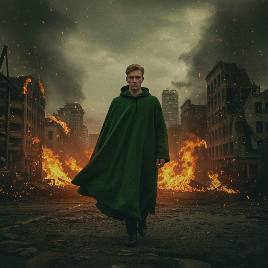 View this AI-generated image featuring a man in a flowing green cloak strides confidently towards us with a city engulfed in flames behind him the buildings crumble signaling the end times yet he moves forward with purpose his presence is slightly distorted like an old photograph blurred and hazy th