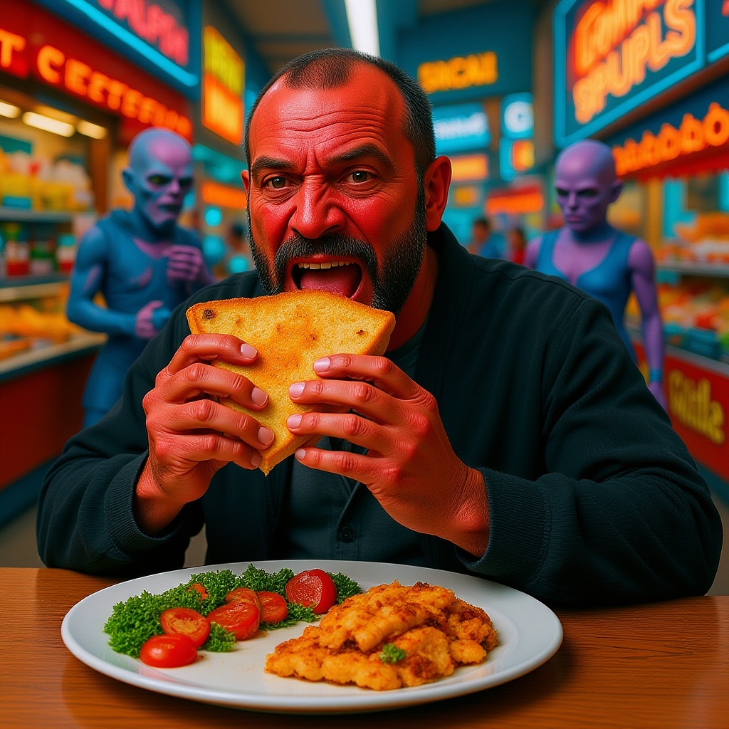 View this AI-generated image featuring darth maul enjoys a hearty sandwich in a bustling alien market surrounded by colorful stalls and exotic creatures his dark robe contrasting with the vivid backdrop while he savors the meal with unexpected delight. Created using advanced AI technology, this imag