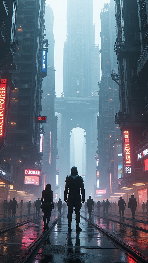 Futuristic figures stand amidst an expansive, massive cyborg metropolis, where towering mechanical structures and complex sci-fi designs dominate the skyline. The scene brims with hyper-realistic detail and a cinematic atmosphere, capturing the sleek interplay of steel and neon lights. Shadows and highlights create stark contrasts, highlighting the intricate network of technologies and vibrant holographic displays that pulse with life. Despite the advanced machinery, the human essence remains palpable, adding an organic heartbeat to the city's technological marvel.