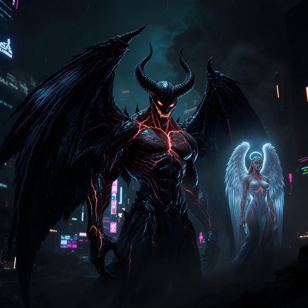 A photorealistic cyberpunk demon stands in the dim shadows of a futuristic city at night. The cityscape is a silhouette, softly illuminated by neon glows in shades of blue, purple, and pink. The demon has a humanoid figure with skin resembling glossy molten lava, marked by cracks and pulsing glowing veins. His expression radiates malice, and his eyes glow with an intense malevolence. Towering from his back are two enormous black wings, textured like scorched feathers or dark steel, projecting a looming shadow. He retains subtle human features, adding an unsettling familiarity, as though he is a fallen angel emerging from a digital dystopia. He is covered in intricate tattoos that seem to shift across his skin. Nearby, a cyberpunk angel stands with a similar human-like appearance, also adorned with tattoos. Her presence is equally modern and intense, with wings that mirror the demon's in their grandeur but emit a faint luminescent aura. The scene is dark and atmospheric, combining the essence of futuristic landscapes with infernal and celestial mythology in a highly detailed and cinematic manner.