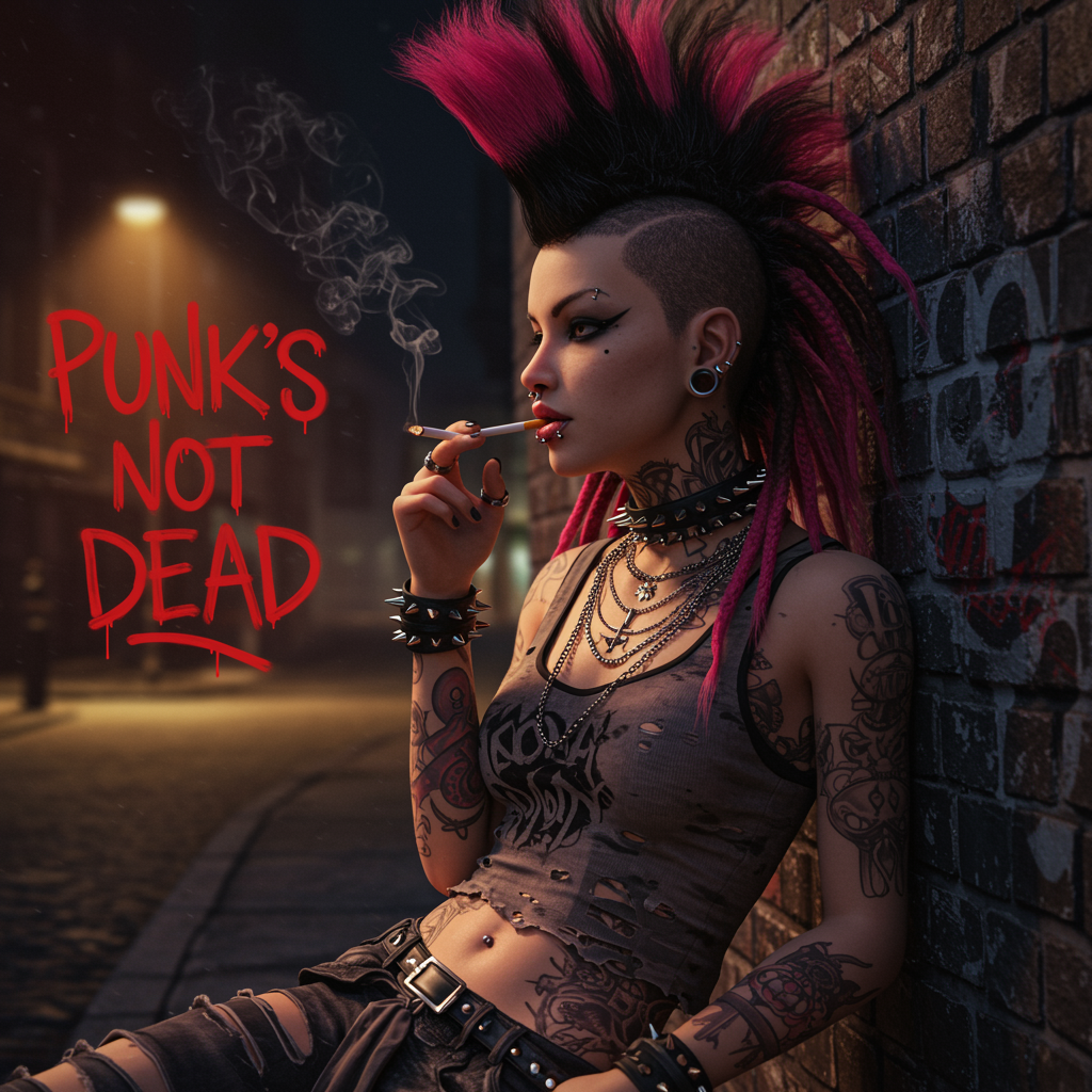 View this AI-generated image featuring a slender punk female reclines casually against a graffiti covered wall the words punk s not dead boldly spray painted in vibrant red she savors a short cigarette exhaling a swirl of smoke into the night air her hair is a striking cascade of intricate dreads in