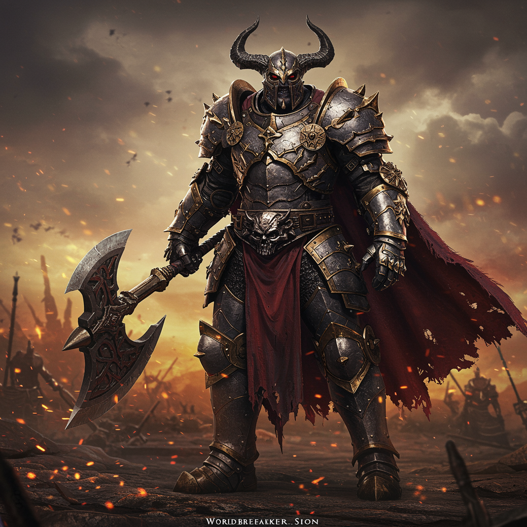 Amidst a chaotic and apocalyptic landscape, capture Worldbreaker Sion in a hyper-realistic photograph showcasing his massive and towering physique. With intricately detailed armor and his signature axe, employ advanced lighting techniques and dynamic posing to highlight the fierce and unrelenting expression on his face, conveying a sense of immense power and destruction. Use a muted and desaturated color palette accentuated by vivid pops of red and black, creating an image that embodies Worldbreaker Sion's catastrophic and world-ending nature. Make subtle creative modifications, maintaining the essence of this formidable character.