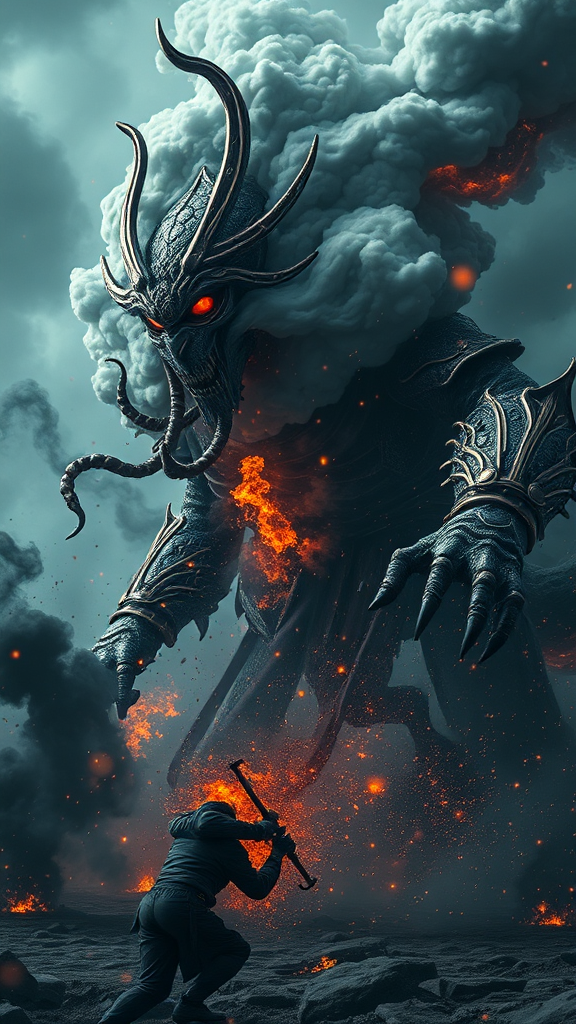 A grotesque behemoth with the aura of a masked divinity, reminiscent of a samurai in swirling action. This creature unleashes a formidable attack upon its foes, enveloped in an ethereal Vincent van Gogh and FW Murano inspired style. Adorned in full-body GALAXY armor, reflecting the cosmos, with plumes of jet black smoke swirling around. The scene explodes with vibrant colors, every detail meticulously captured, casting a morbid yet mesmerizing atmosphere. The dark setting is filled with striking key visuals, creating a highly realistic and atmospheric mood. An ultra-wide epic shot captures the intensity and grandeur of this mythical warfare, amidst a landscape that seems to breathe the chaos and beauty of a cosmic battlefield.