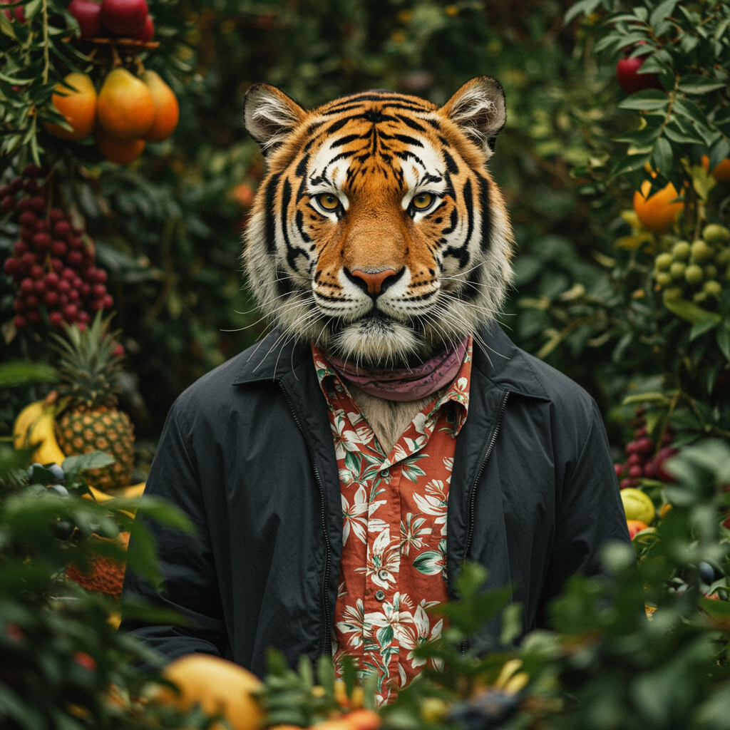 A vibrant tiger adorned in a sleek jacket, a patterned Hawaiian floral shirt, and a cozy scarf, poses majestically within a lush jungle setting surrounded by verdant plants and leaves. Accompanied by a man in a distinctive jacket reminiscent of Christian W. Staudinger's style, this scene captures the essence of animal photography devised for an album cover. The composition channels maximalism with dramatic eyeliner effects inspired by fking_scifi, evoking a style akin to L. Frank Baum’s storytelling. The backdrop is an exotic display of diverse fruits, framed in panoramic view. Shot using 16mm film, the color grading resembles Kodak Portra 400, with ultra-realistic textures and colors. The tiger's eyes exhibit remarkable detail, with textured skin, subtle fuzz, and signs of dry skin, all captured by a cinematic camera. This image, devoid of any negative elements such as cartoon-like features or excessive digital alterations, resonates with the essence of RAW, candid cinema designed to showcase authenticity and artistic integrity.