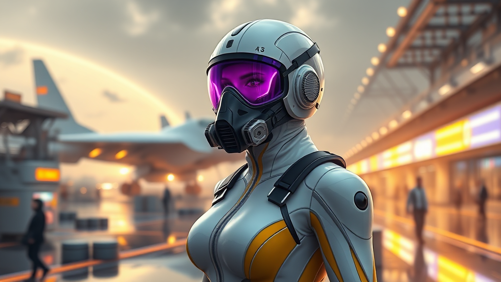 View this AI-generated image featuring a female character wears a sleek tight fitting white and yellow jumpsuit with intricate detailing standing at a bustling spaceport behind her a majestic spaceship is taking off casting dramatic shadows she sports a futuristic mask and a striking purple sci fi v