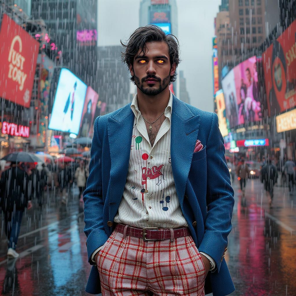 A handsome Mediterranean man stands confidently in rainy Times Square, his medium hair tousled and face strikingly symmetrical. His bright eyes glisten with highlights, capturing the detailed essence of his full-body presence. Donning a retro outfit with a quirky, artistic twist, he exudes an appealing blend of charisma and distinctive style. Despite the chaotic urban backdrop, his image remains magnetic, drawing attention to his unique charm and slightly unconventional proportions that hint at an artistic reinterpretation of reality. His ensemble and posture meld together in a harmonious yet slightly abstract impression, leaving an indelible mark on the bustling city scene.
