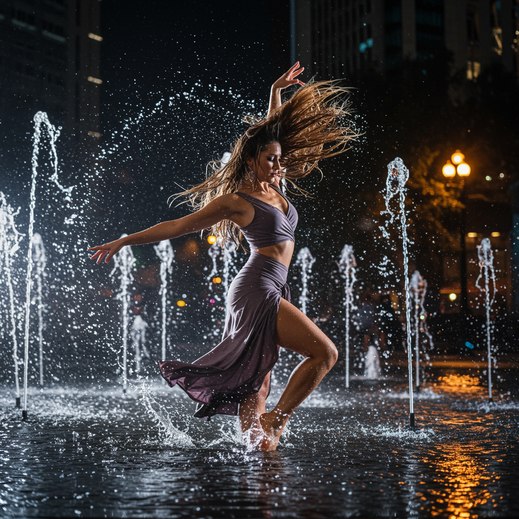 View this AI-generated image featuring artistic photography of a gorgeous bachata dancer in dynamic motion within a sprawling city fountain wearing a sleek flowing bachata outfit hair wildly wet accentuating an hourglass figure infused with luminism illuminated by bar inspired lighting maximalist ae