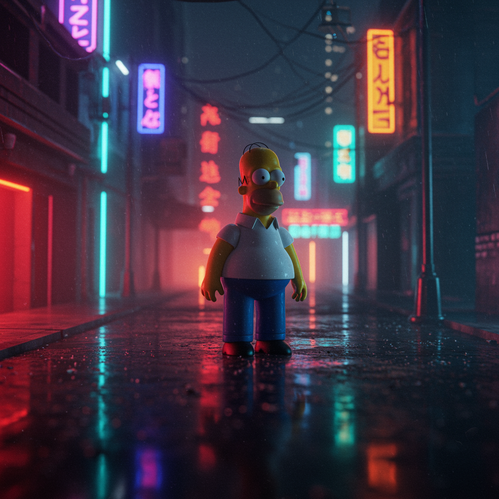 View this AI-generated image featuring in a dark rain soaked dystopian metropolis homer simpson stands alone on an abandoned street neon lights flicker around him casting colorful reflections across wet pavement the scene is cinematic and moody evoking a blade runner atmosphere despite the dreary se