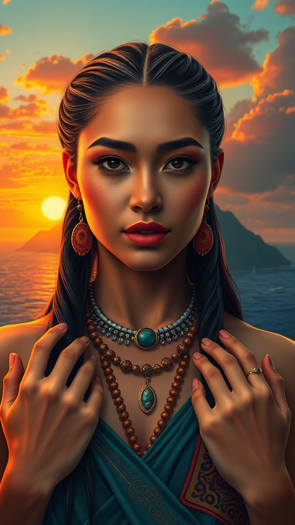A captivating full body portrait of a Māori woman set against an island backdrop at sunset, inspired by the style of Charlie Bowater. The scene features a volumetric atmosphere, showcasing exceptional quality with sharp focus. Her face is strikingly beautiful, and her hands are elegantly positioned. This high-resolution image is vibrant and intricately detailed, with stunning linework, providing a breathtaking and cinematic experience. The artwork is in 4K UHD, demonstrating award-winning quality and trending on art platforms. The composition includes a dynamic pose and maintains exceptional clarity, ensuring the artistry is both exquisite and precise.