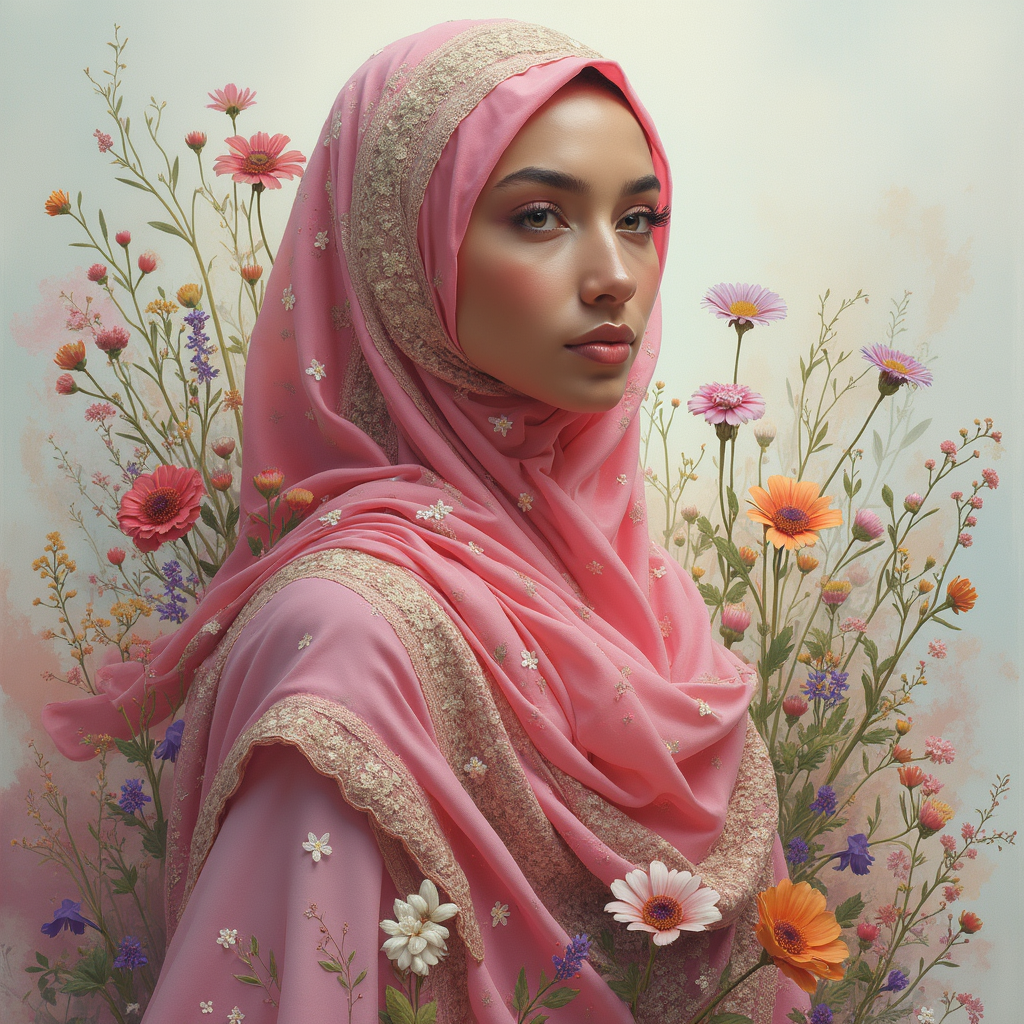 View this AI-generated image featuring portrait of a hijabi warrior adorned in a flowing scarf surrounded by a splash of pastel hues intertwined with lush plants and delicate flowers inspired by the intricate art style of tom bagshaw set against a dramatic and elongated 9 16 aspect ratio to capture